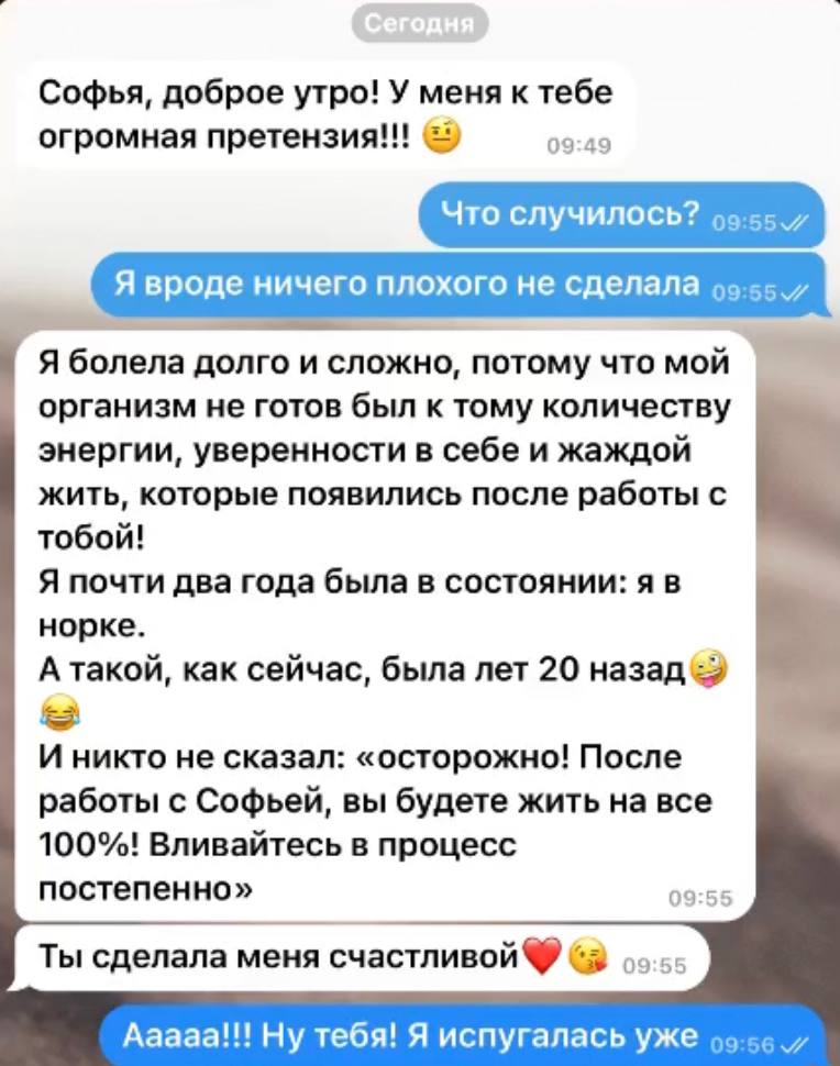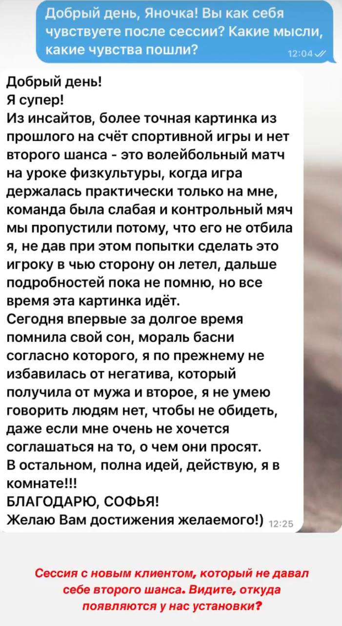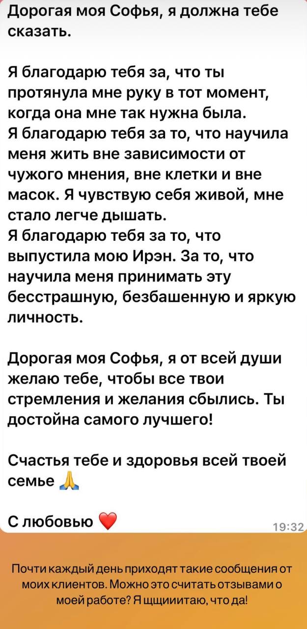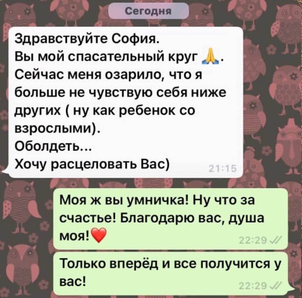 Давай я покажу тебе отзывы. Я настолько уверена в результате, что готова его гарантировать. Если ты посещаешь все сессии, делаешь домашние задания, применяешь все инструменты, но не получаешь результата после программы, тогда я верну тебе деньги