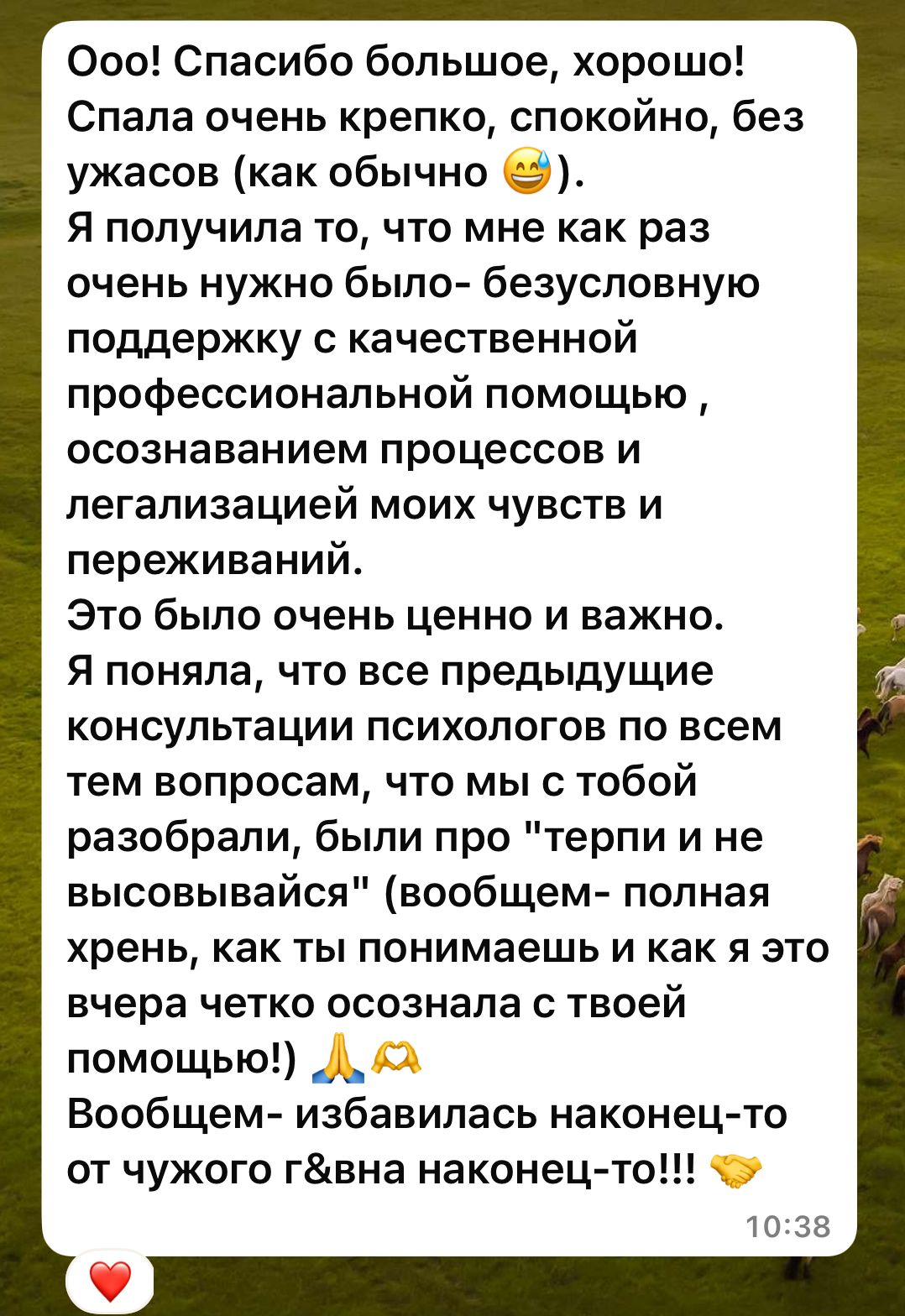 Простое и открытое общение Я создаю пространство, где можно быть собой. Мы общаемся честно, на равных, что помогает глубже проработать страхи, убеждения и установки.