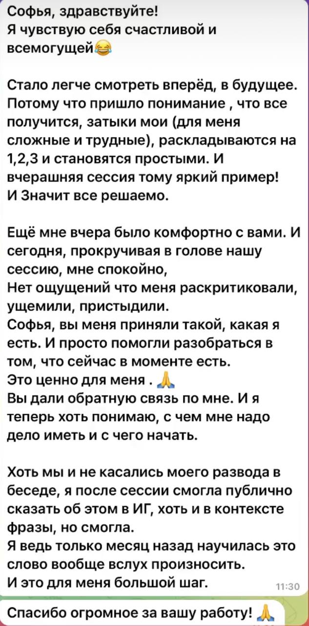 Гибкий график онлайн-сессий Мы заранее согласуем удобное время, продолжительность и формат работы. Вместе составим чёткий пошаговый план.