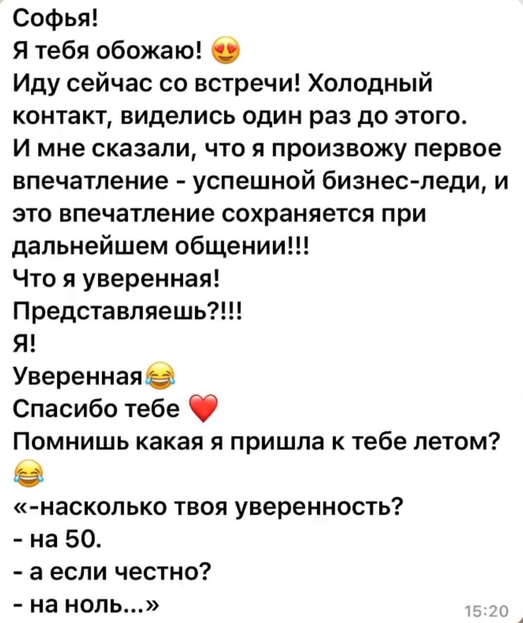 Поддержка и мотивация После каждой сессии ты получаешь конкретные задания. Я слежу за прогрессом, вдохновляю и мягко направляю вперёд - потому что я действительно заинтересована в твоём результате.